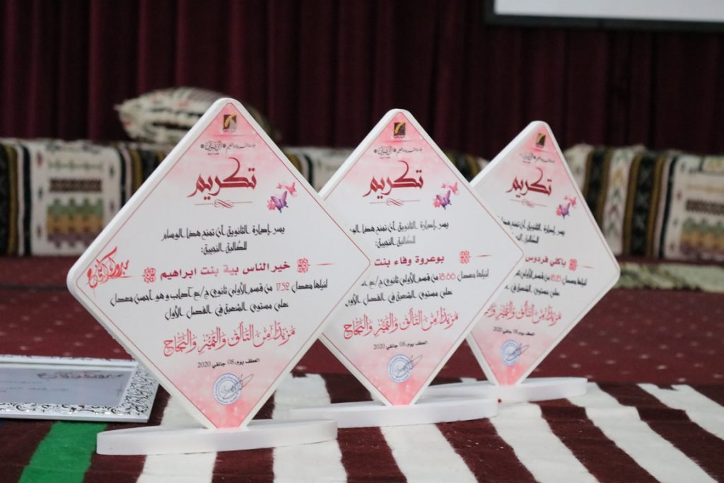 اختتاما للفصل الأول وبمناسبة السنة الأمازيغية الجديدة نظمت إدارة الثانوية وقفة تكريمية للمتفوقات في امتحانات الفصل الأول والمتحصلات على مقرر القرآن الكريم..شهد الحفل كذلك حضور أولياء الطالبات الخاتمات والمستظهرات..وتم استضافة الفنان القدير داودي عمر ليتحف الحضور بباقة أناشيد بالمناسبة…كما تم تكريم الدكتور باعمارة الحاج ابراهيم بمناسبة حصوله على شهادة الدكتوراه من الجامعة الاسلامية بماليزيا فألف مبروك له ولكل الطالبات المتفوقات.